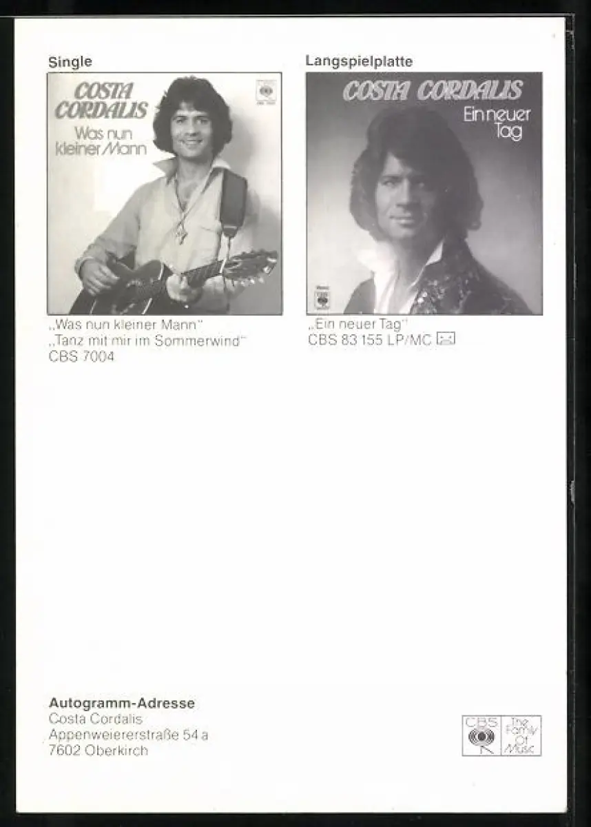 AK Musiker Costa Cordalis vor blauem Hintergrund, Autograph