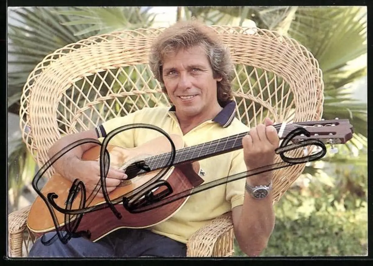 AK Musiker Erik Silvester mit Gitarre im Flechtstuhl, Autograph