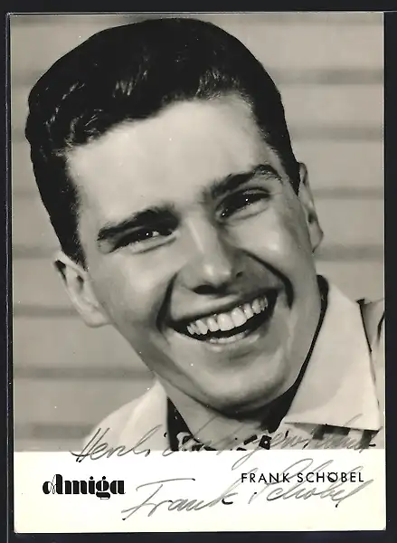 AK Musiker Frank Schöbel lachend im Porträt, Autograph