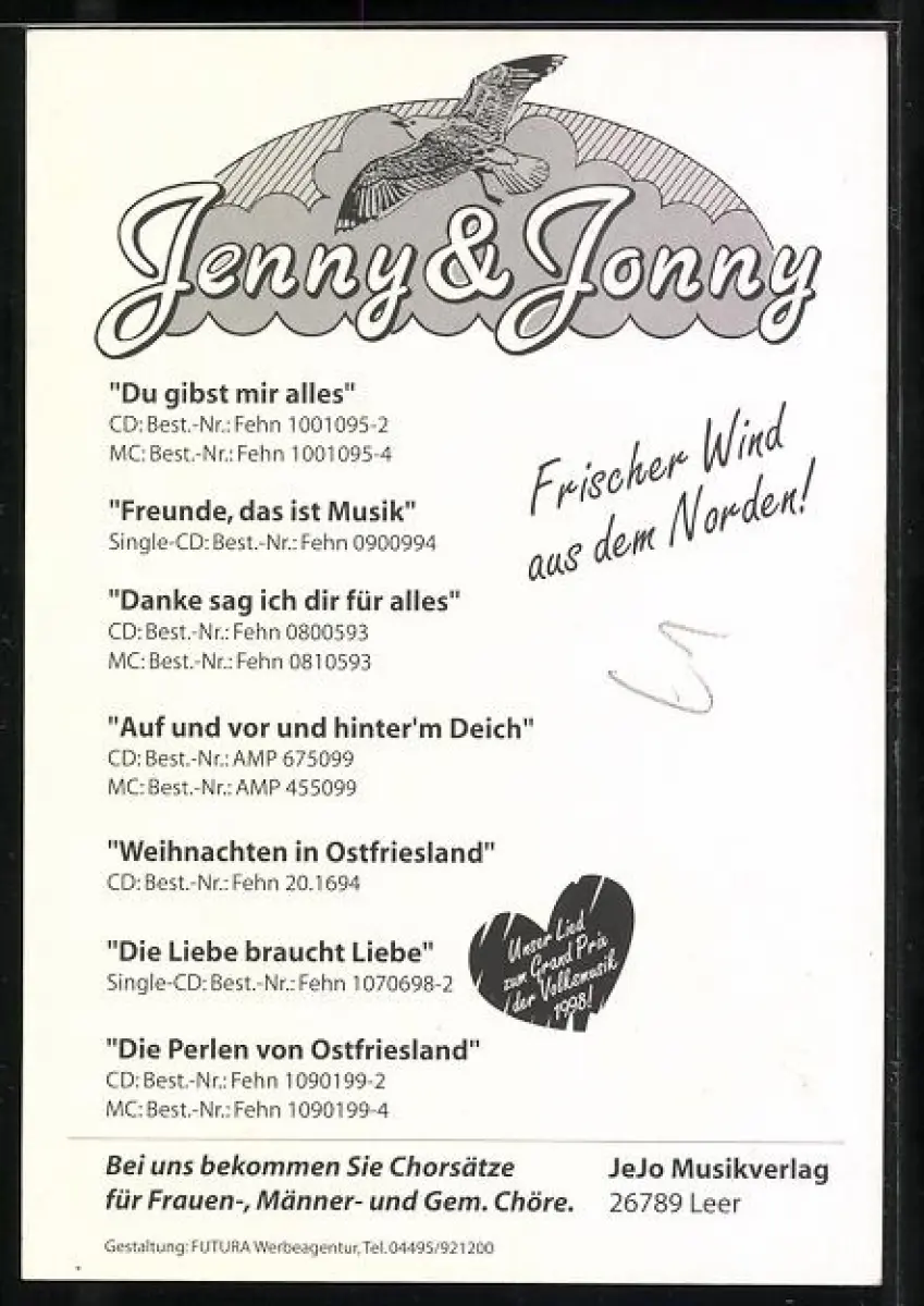AK Musiker Jenny & Jonny lächelnd im Porträt, Autograph