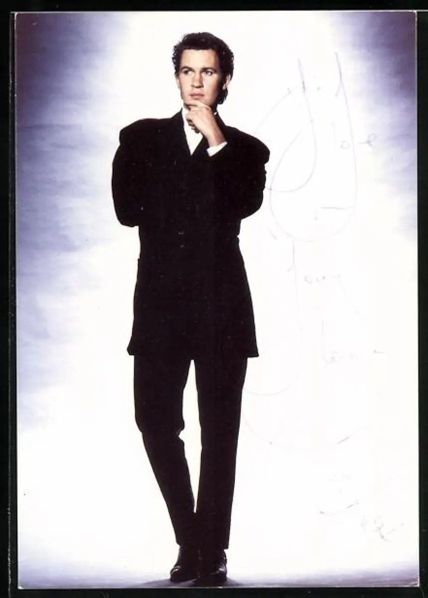 AK Musiker Johnny Logan im schwarzen Anzug vor einer hellen Wand