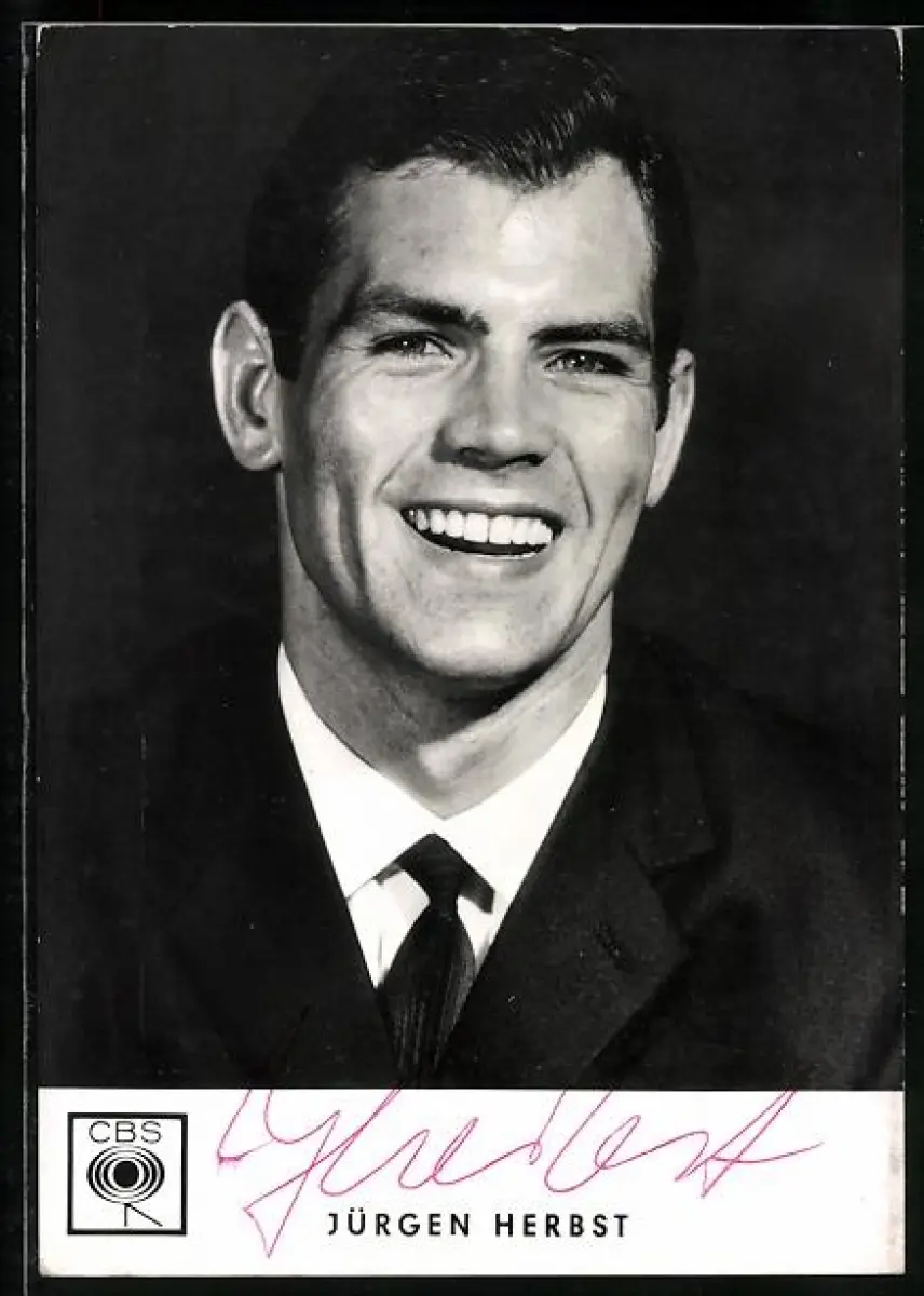 AK Musiker Jürgen Herbst lacht den Betrachter an, Autograph