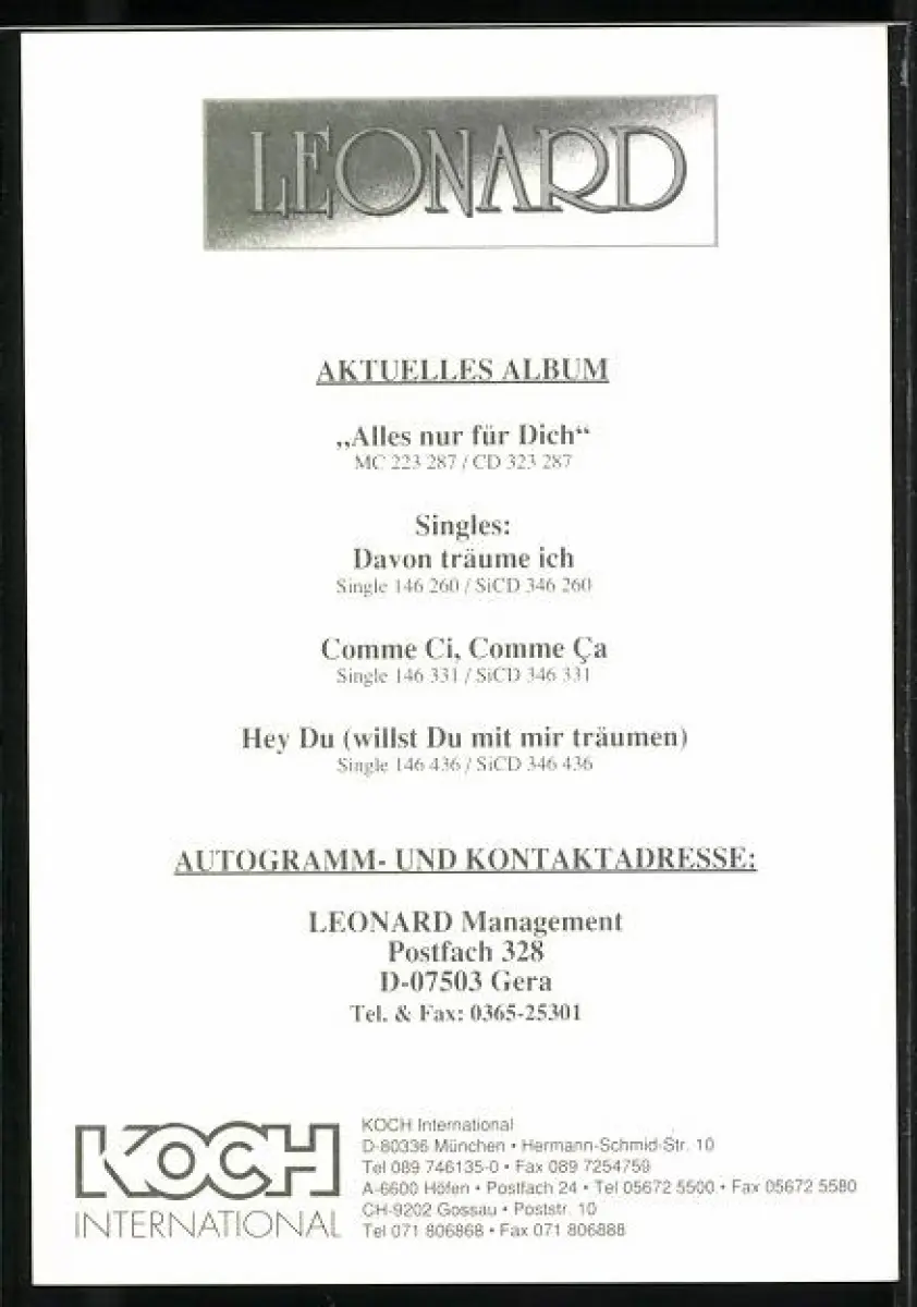 AK Musiker Leonard vor blauem Hintergrund, Autograph