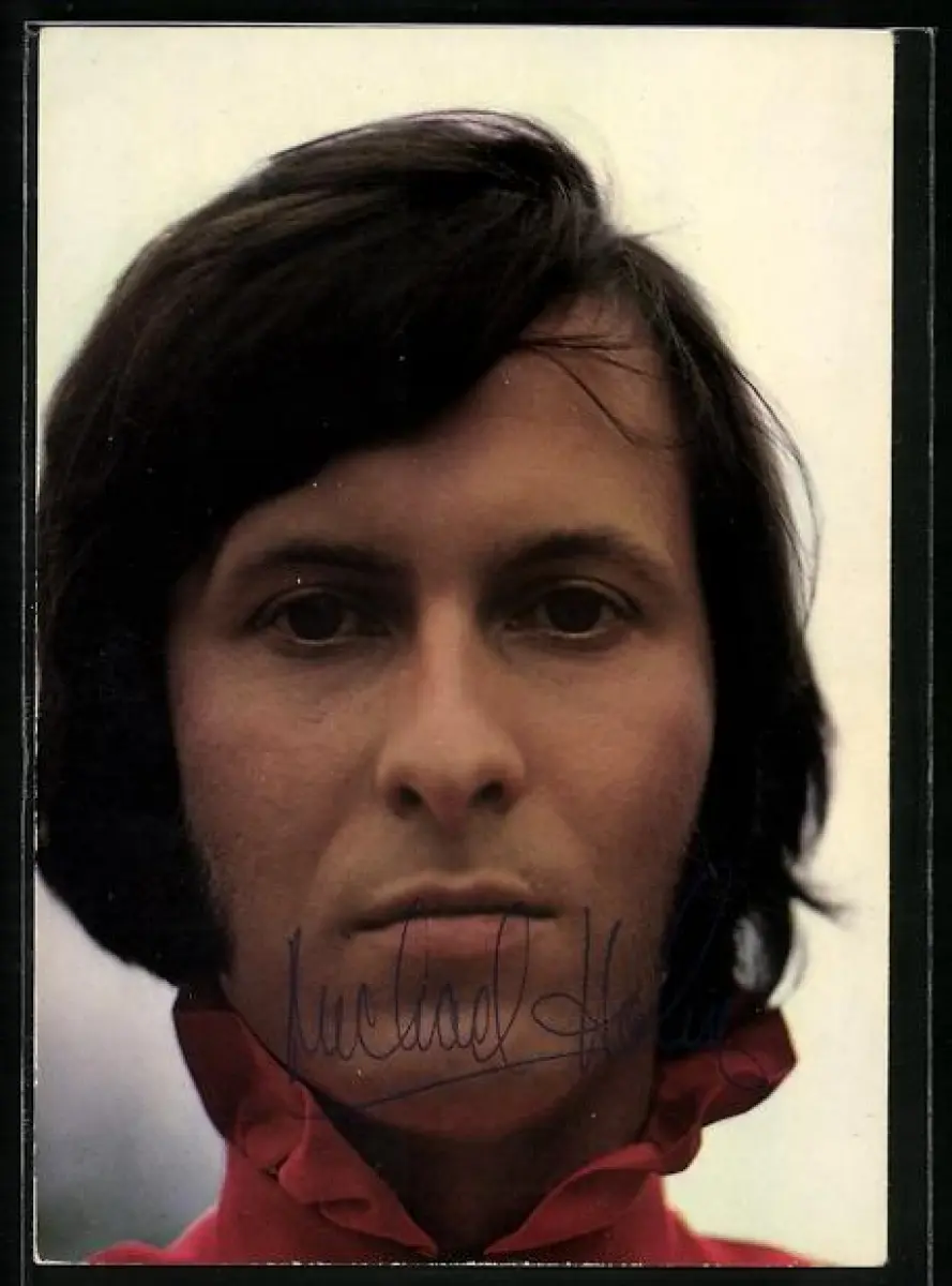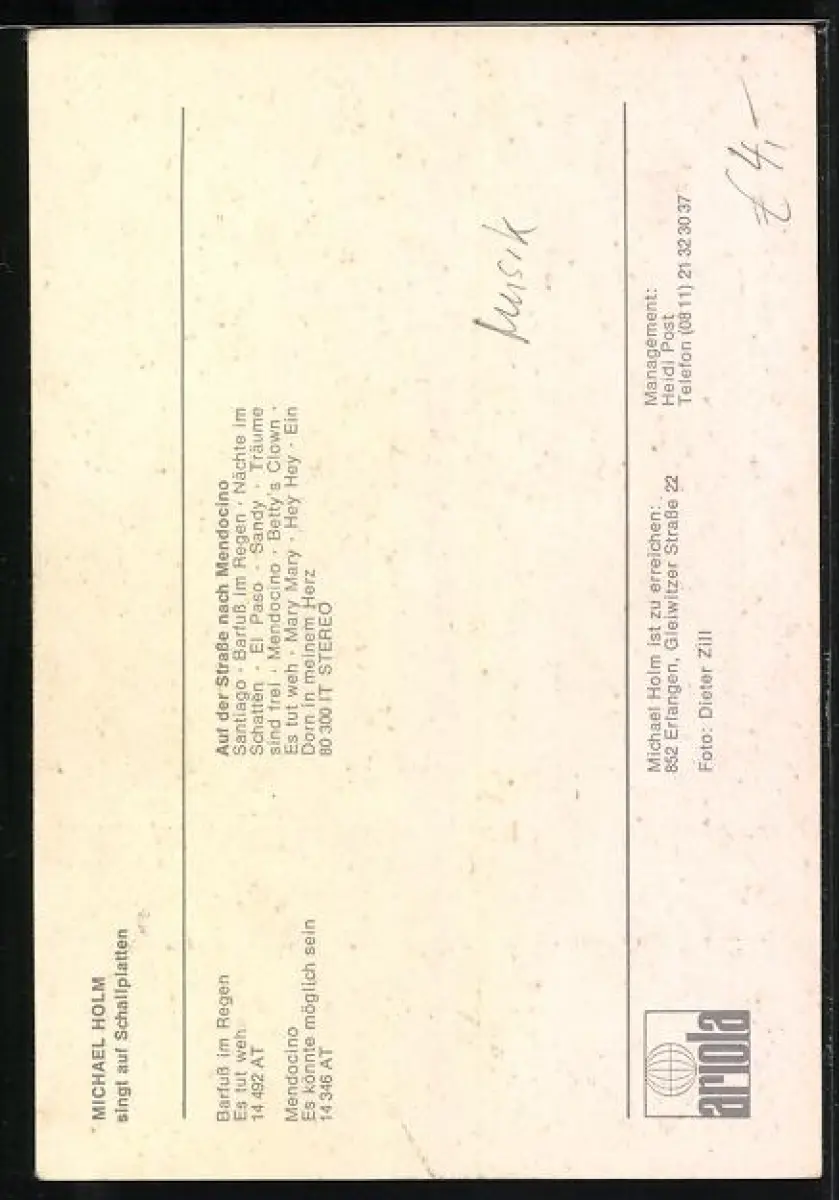 AK Musiker Michael Holm blickt mit ernster Mimik in die Kamera, Autograph