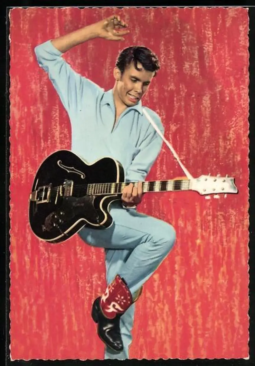 AK Musiker Peter Kraus mit Gitarre und Cowboy Stiefeln