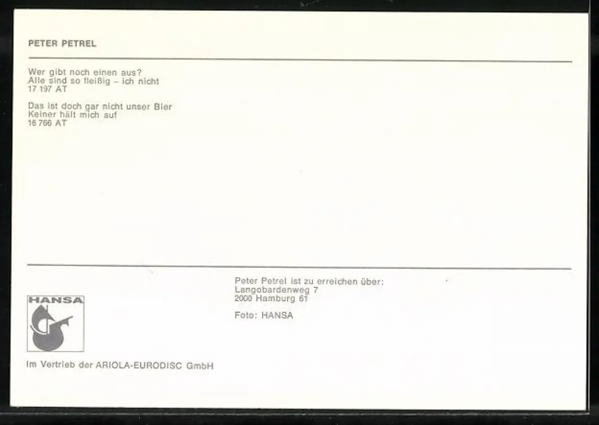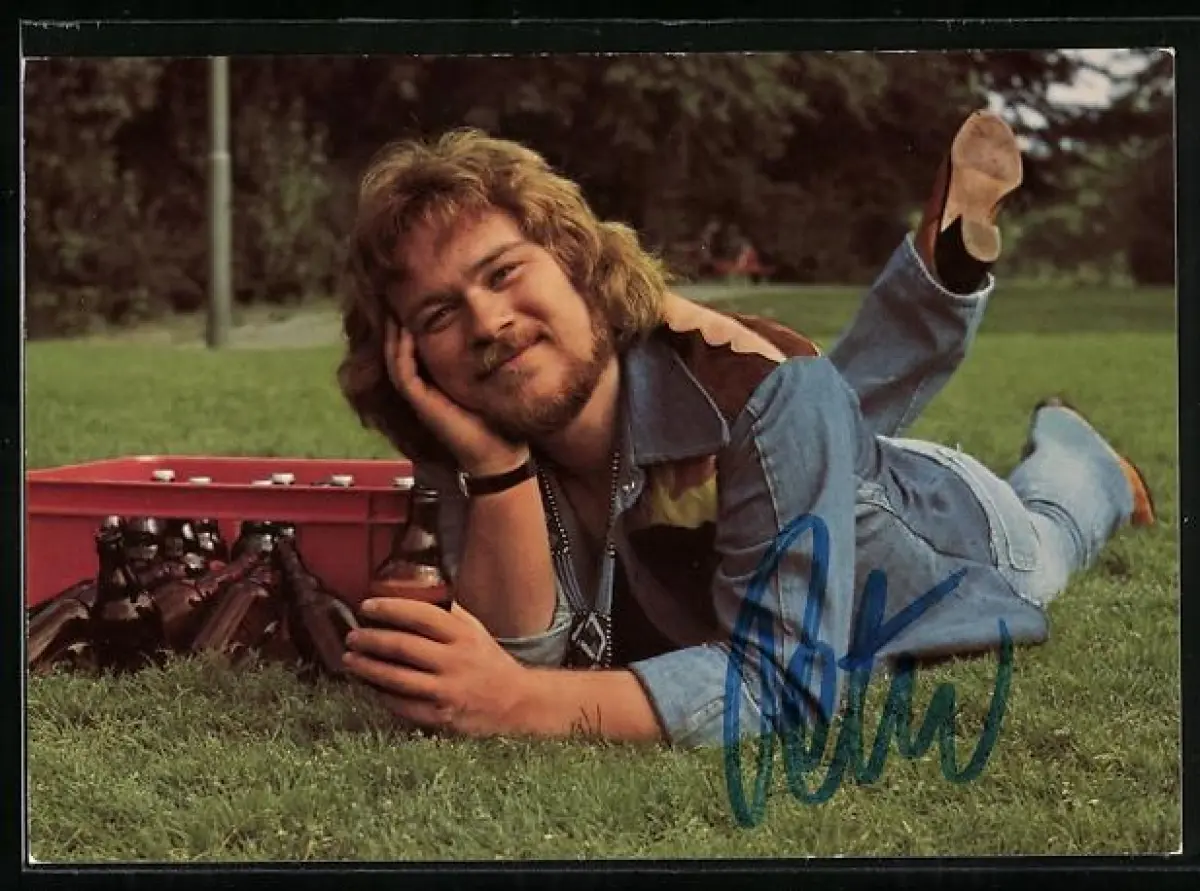 AK Musiker Peter Petrel mit einer Bierkiste auf einer Wiese, Autograph