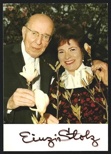 AK Musiker Robert Stolz mit Magnolienblüte, Autograph von Einzi Stolz