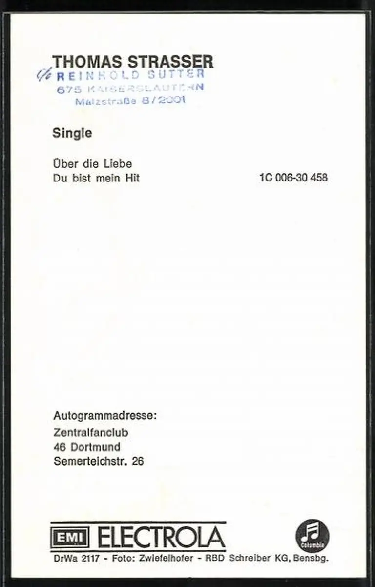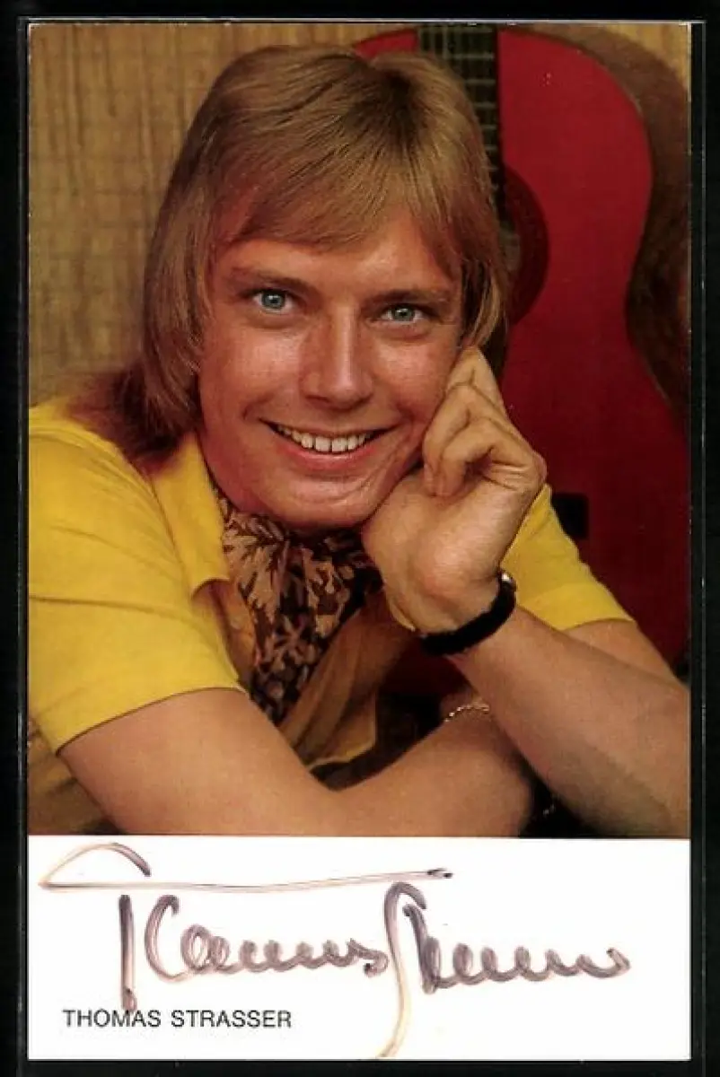 AK Musiker Thomas Strasser auf seinem Arm gelehnt schaut in die Kamera, Autograph