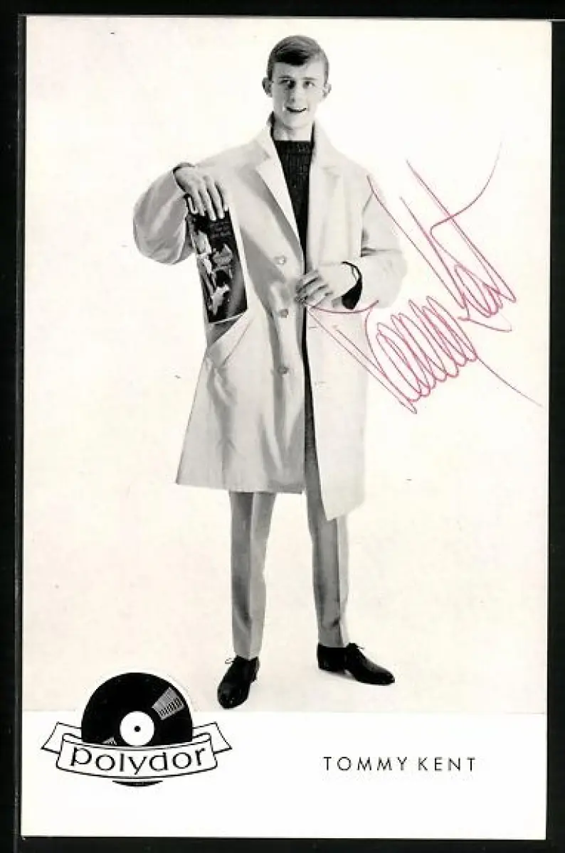 AK Musiker Tommy Kent im Mantel mit einer Zeitschrift, Autograph