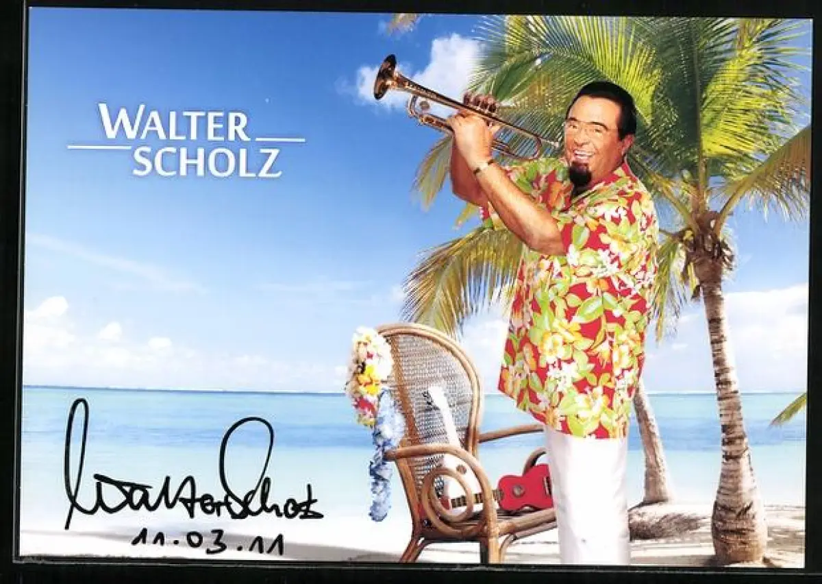 AK Musiker Walter Scholz mit Trompete am Strand, Autograph