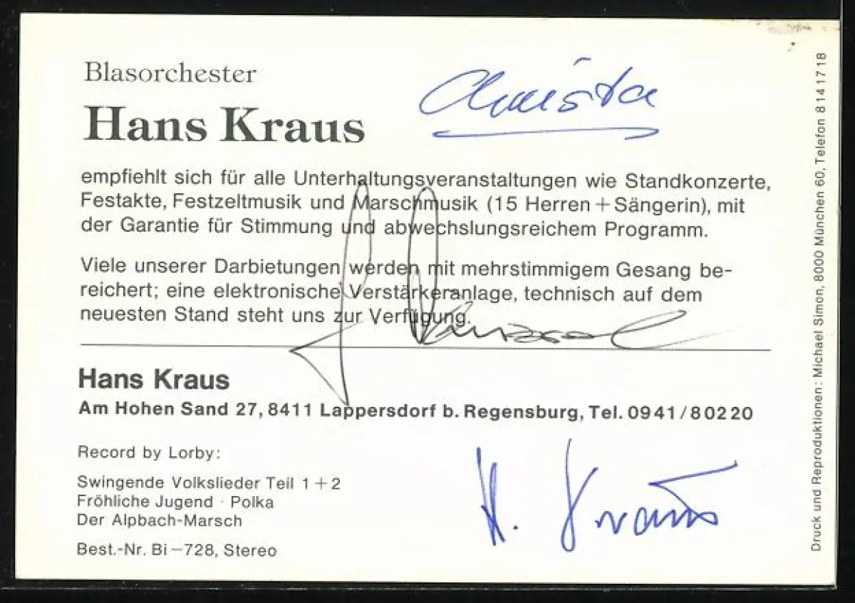 AK Musiker des Hans Kraus Blasorchesters mit Instrumenten, Autogramme