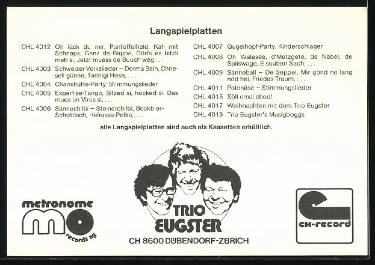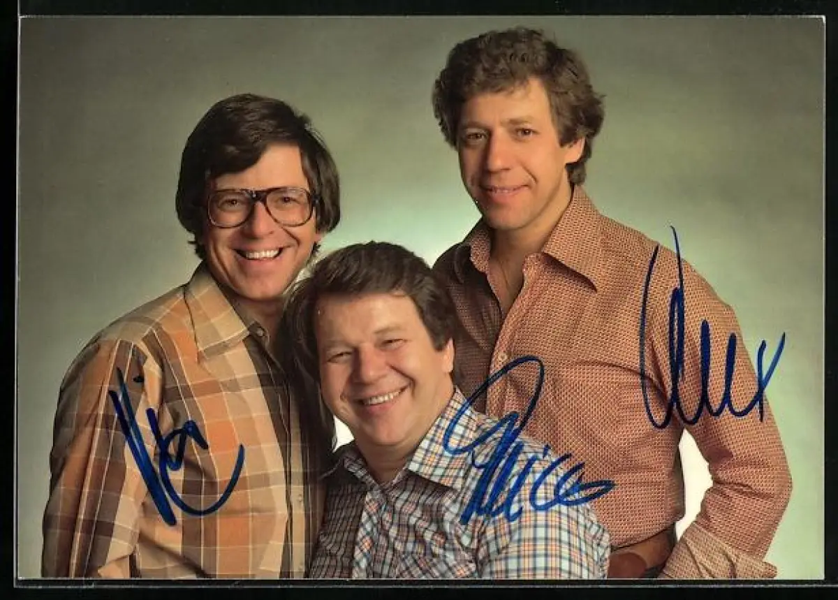 AK Musiker des Trios Eugster lächeln in die Kamera, Autogramme