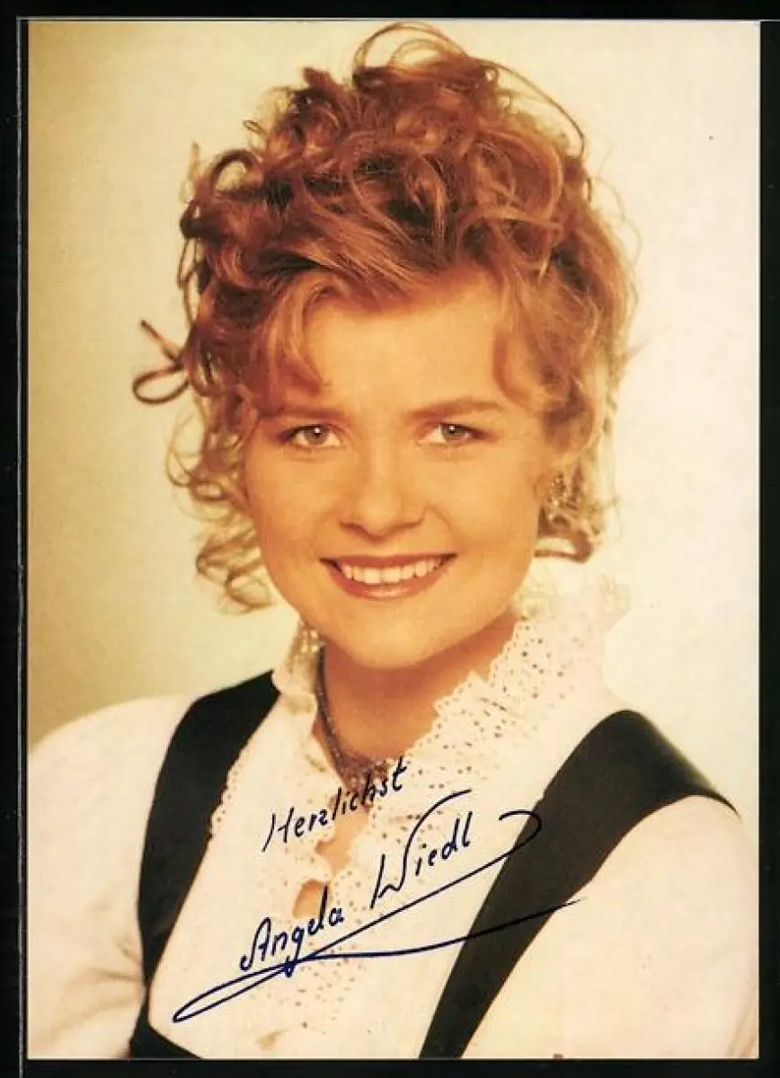 AK Musikerin Angela Wiedl lächelnd im Porträt, Autograph