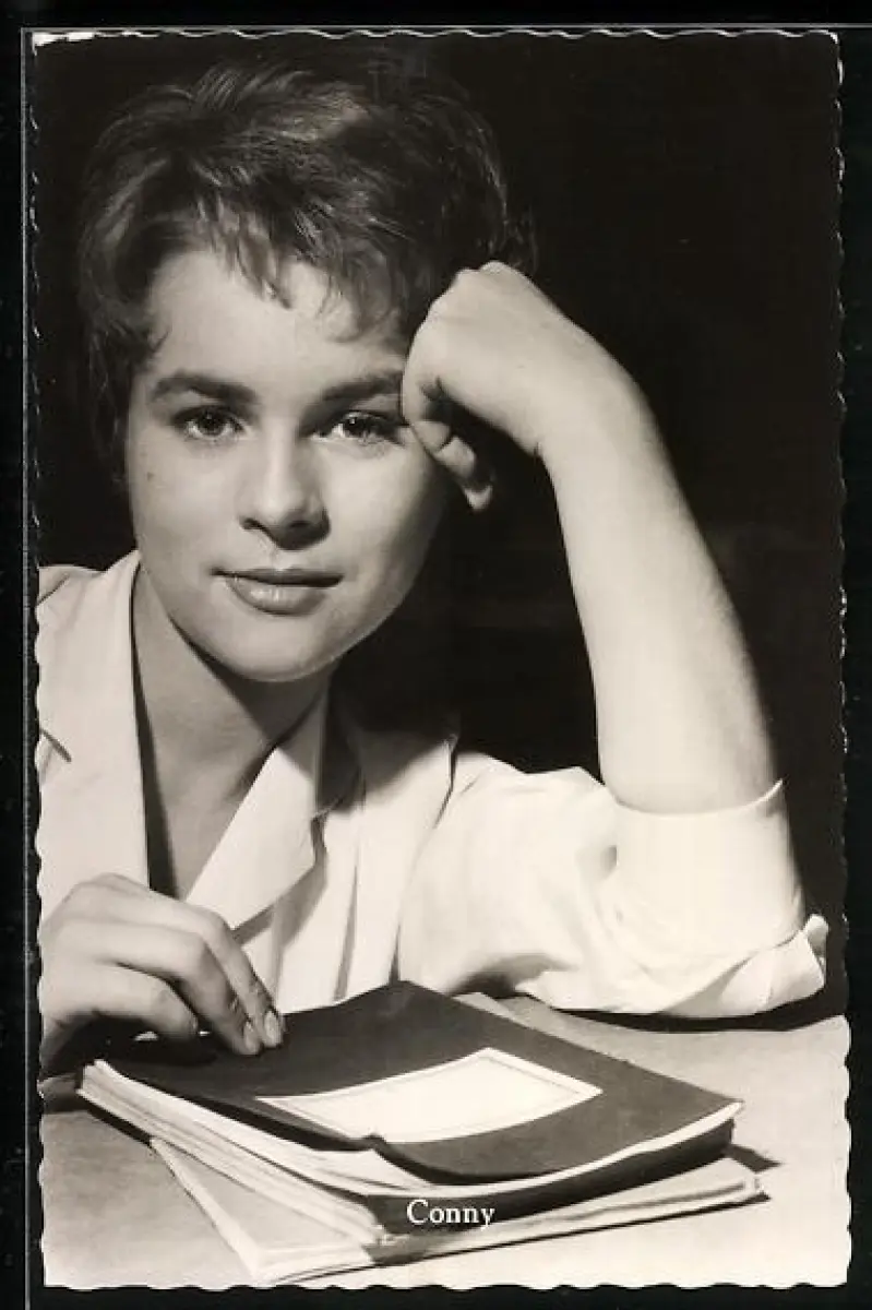 AK Musikerin Conny Froboess, an einem Tisch stützend mit Heftern