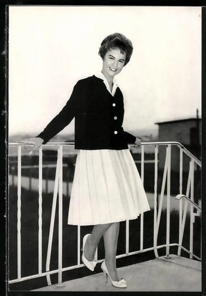 AK Musikerin Conny Froboess im weissen Rock an einem Terrassenzaun