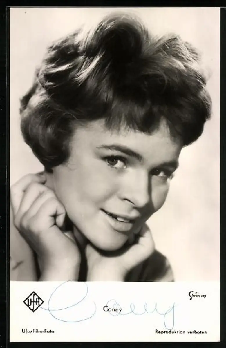 AK Musikerin Conny Froboess lächelnd den Kopf mit den Händen abstützend, Autograph