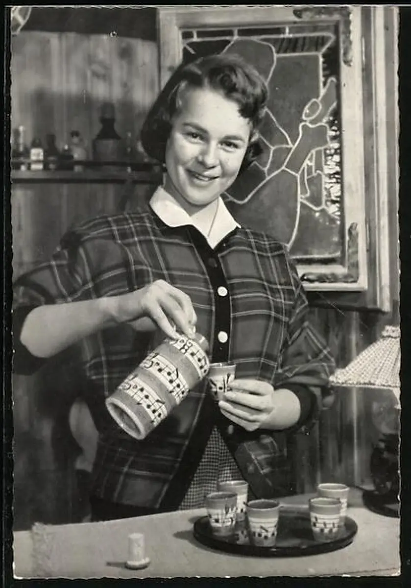 AK Musikerin Conny Froboess lächelnd einen Becher füllend