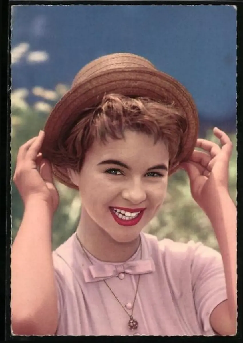 AK Musikerin Conny Froboess lächelnd mit Hut posierend