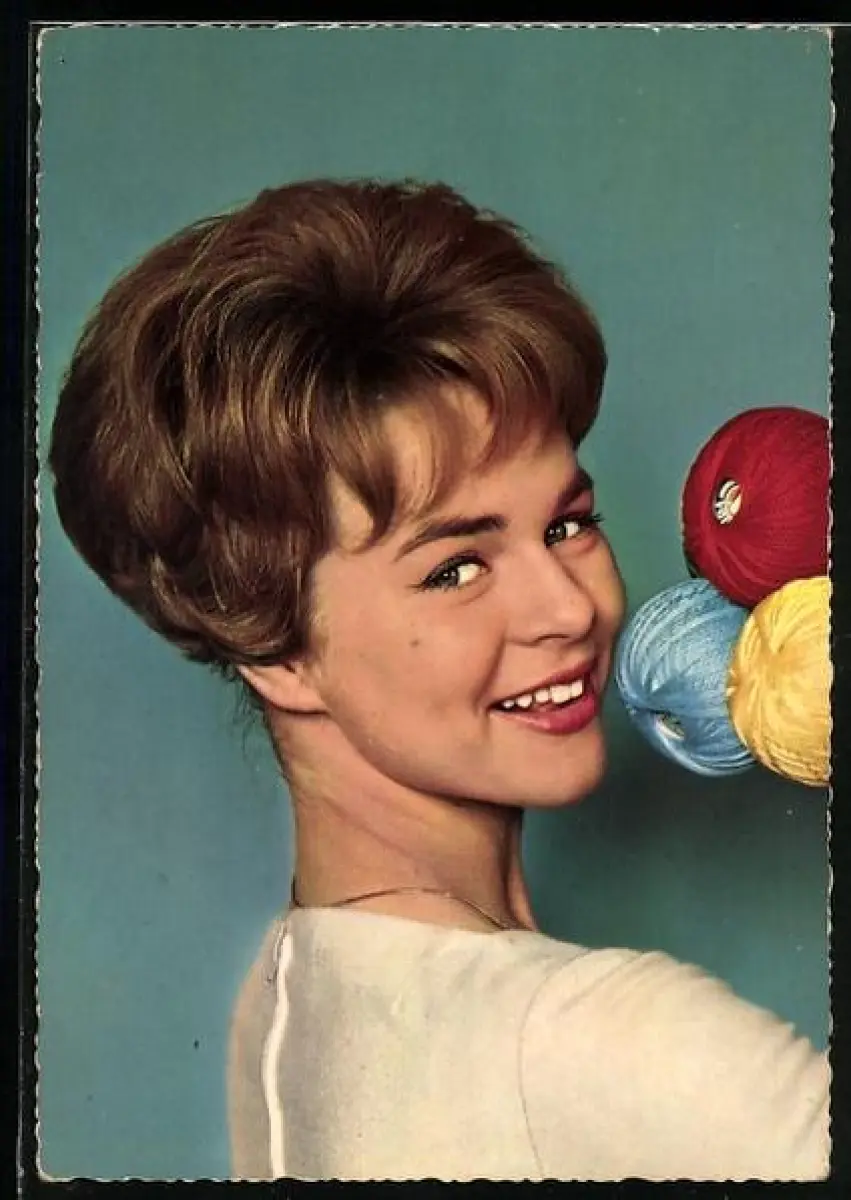 AK Musikerin Conny Froboess posiert neben drei Wollknäueln