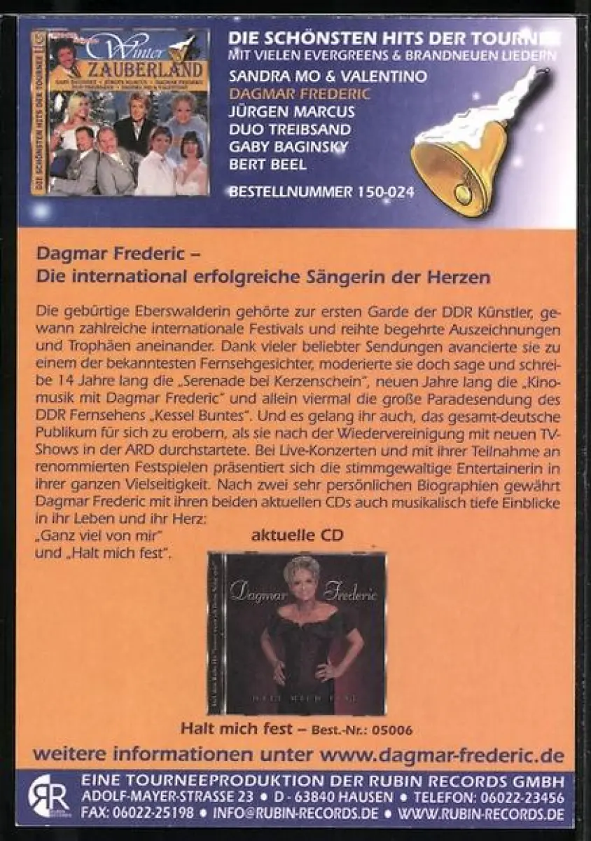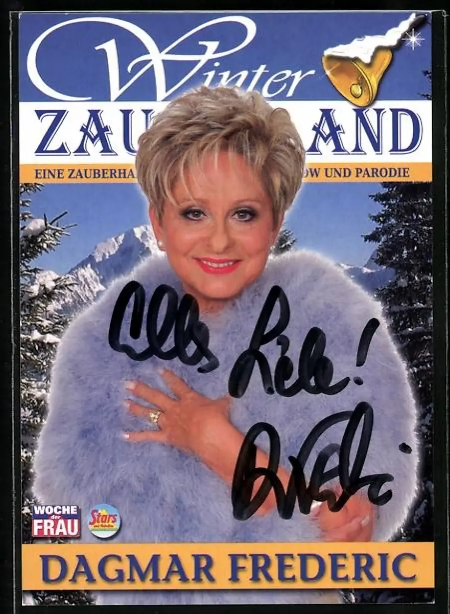 AK Musikerin Dagmar Frederic lächelnd im Porträt, Autograph