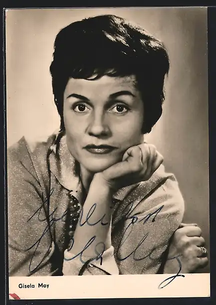AK Musikerin Gisela May stützt den Kopf auf die Hand, Autograph