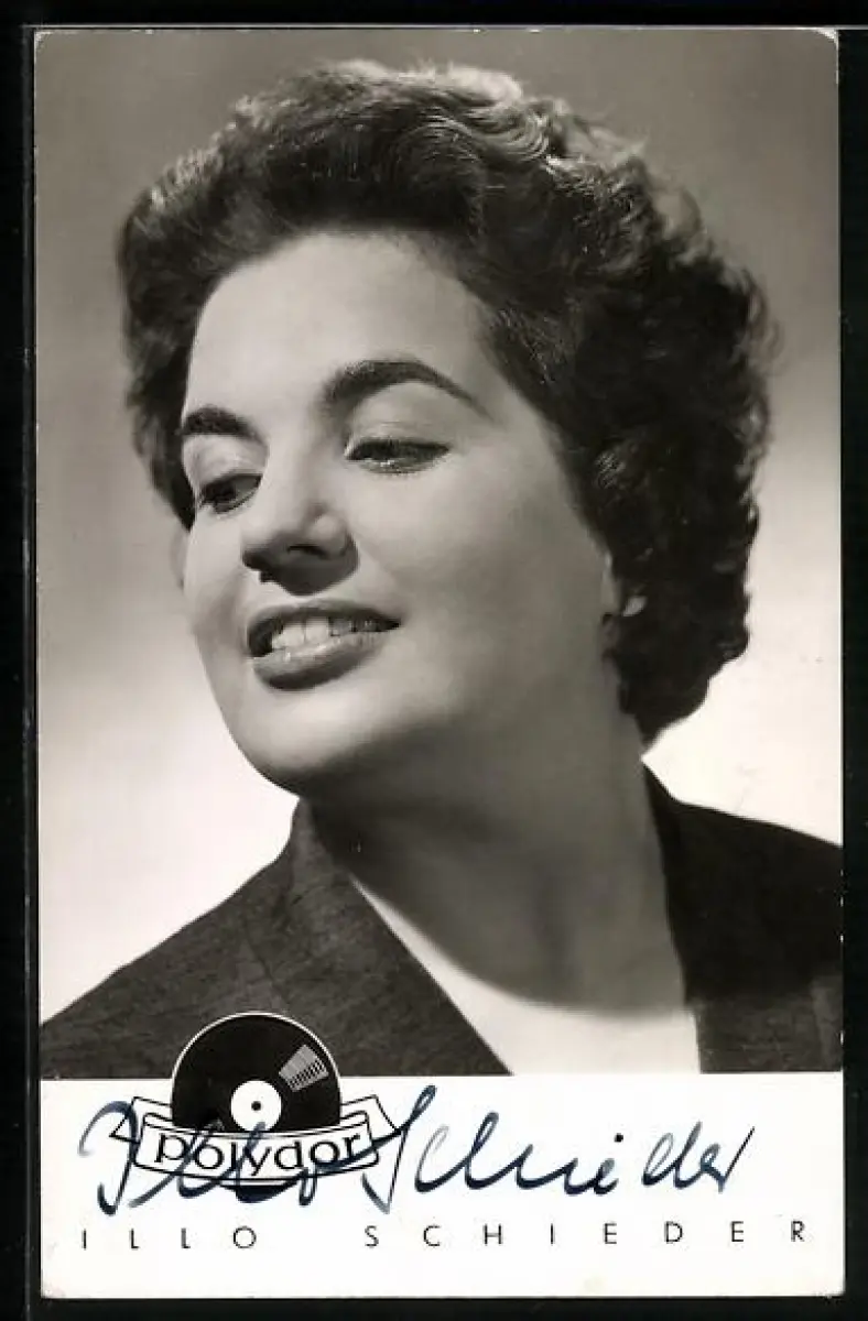 AK Musikerin Illo Schieder lächelnd zur Seite blickend, Autograph