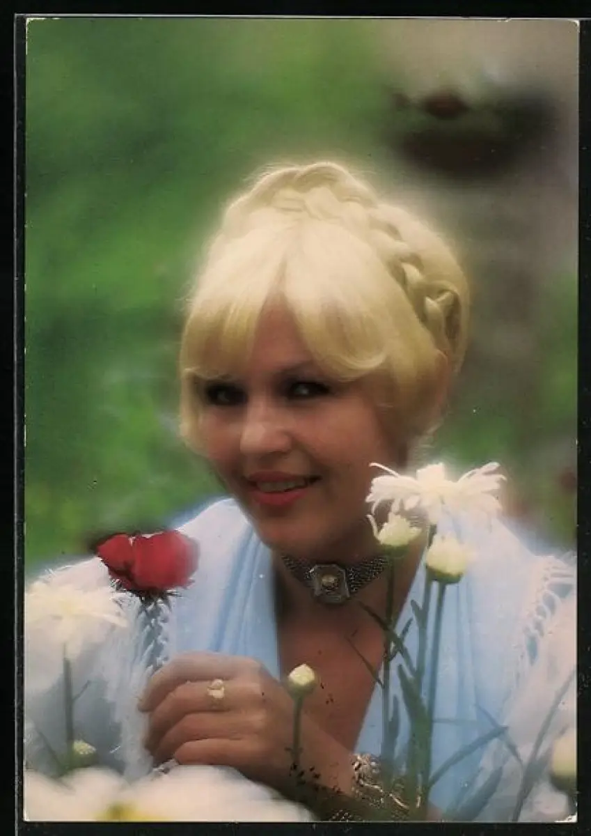 AK Musikerin Käthi Nowak auf einer Blumenwiese
