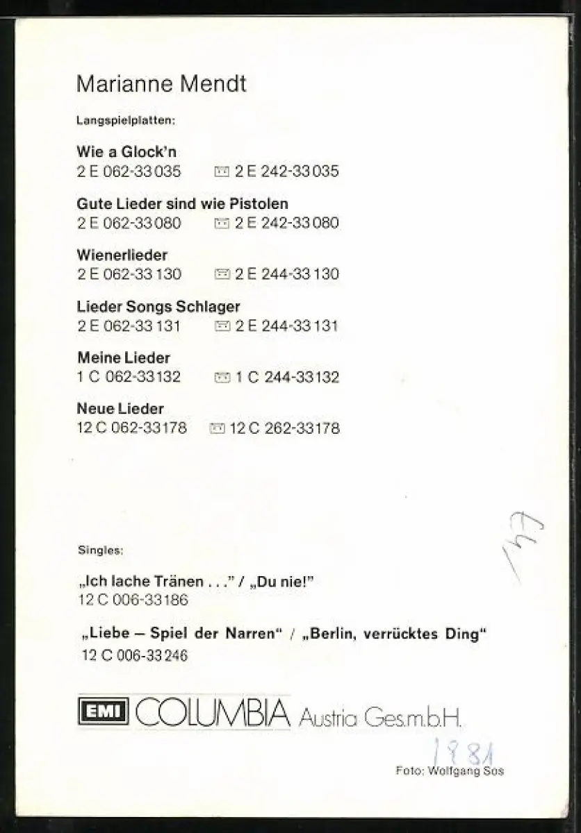 AK Musikerin Marianne Mendt im Portrait, Autograph