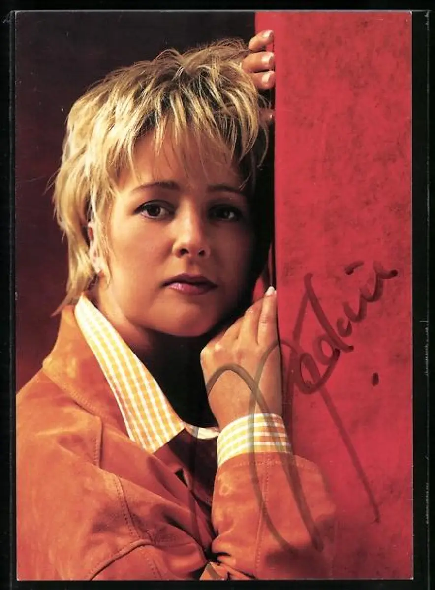 AK Musikerin Nadine Norell an samtene Wand geschmiegt, Autograph