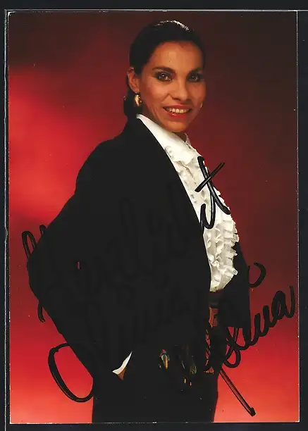 AK Musikerin Olivia Molina in schwarzem Anzug, Autograph