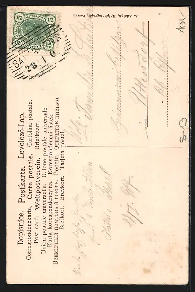 Personenbezogene Daten auf der Rückseite der Karte wurden durch blauen Textmarker unkenntlich gemacht. Die blauen Stellen sind auf die Vorderseite durchgeweicht und wirken sich negativ auf das Postkartenfoto aus