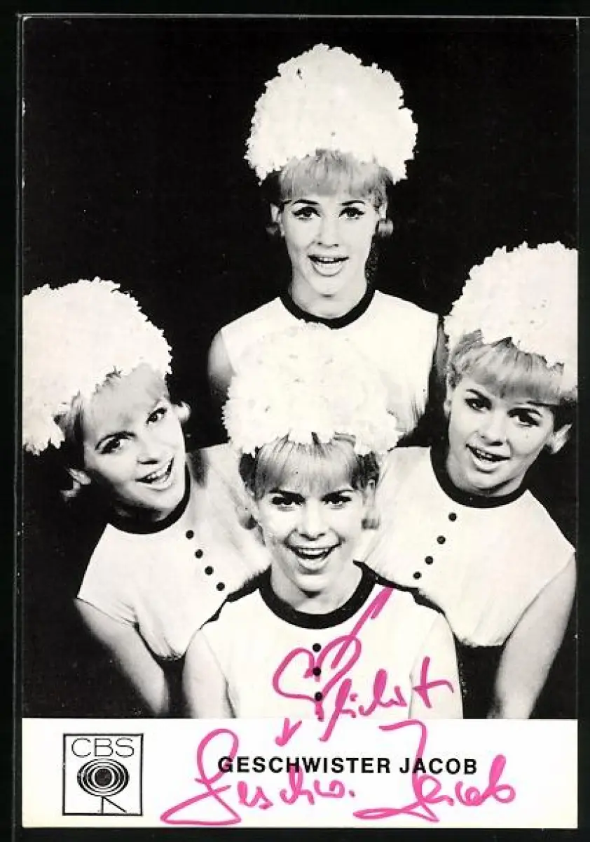 AK Musikerinnen Geschwister Jacob in identischer Kleidung, Autograph