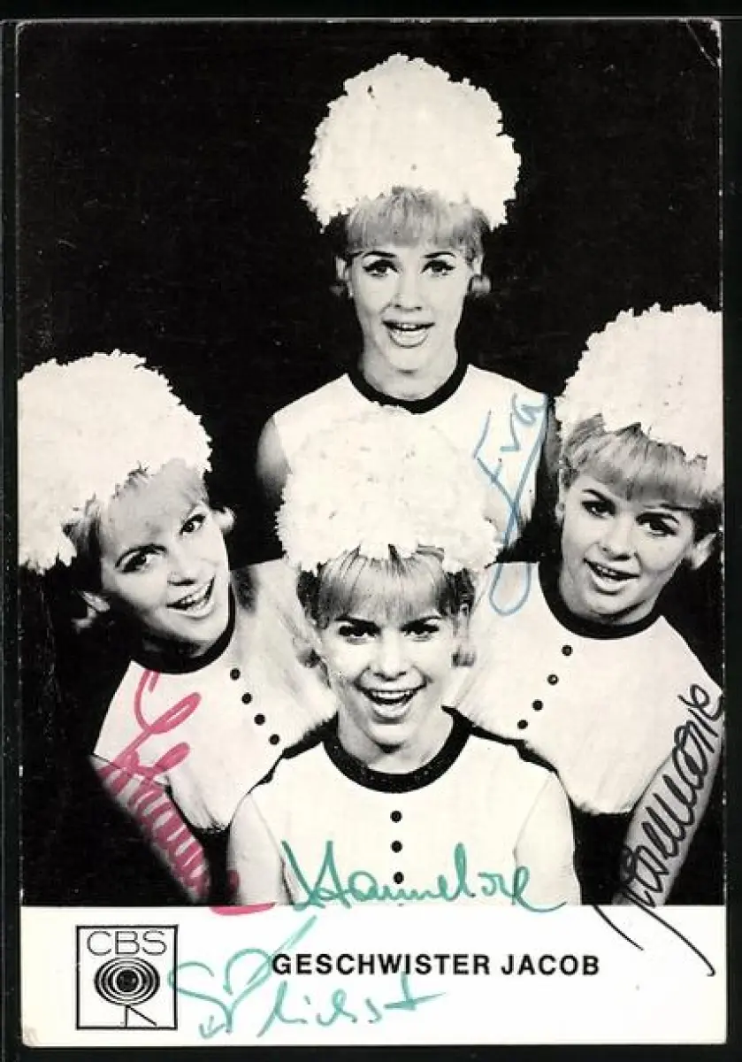 AK Musikerinnen Geschwister Jacob mit imposanten Kopfbedeckungen