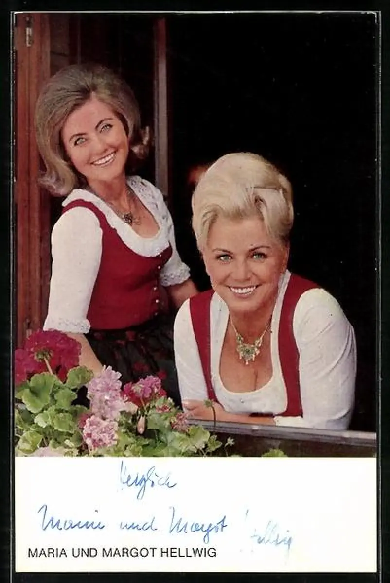 AK Musikerinnen Maria und Margot Hellwig, Trachtentragend an einem Fenster stehend