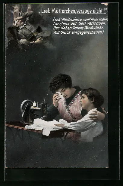 AK Mutter an Nähmaschine weint