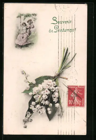 AK Mutter mit Kind auf einer Schaukel und Maiglöckchen