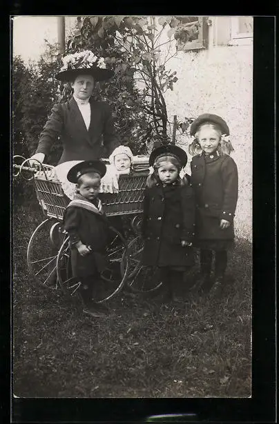 AK Mutter mit Kindern, Baby im Kinderwagen