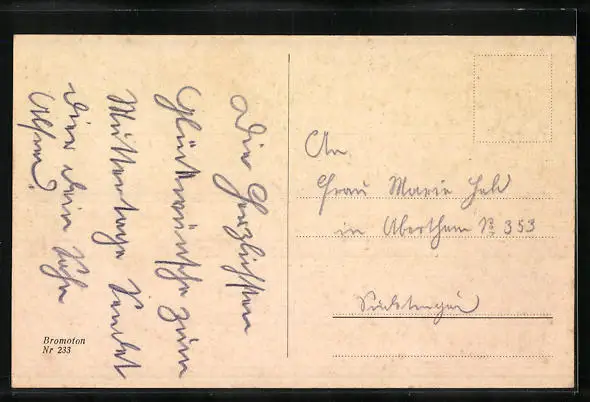Personenbezogene Daten auf der Rückseite der Karte wurden durch blauen Textmarker unkenntlich gemacht. Die blauen Stellen sind auf die Vorderseite durchgeweicht und wirken sich negativ auf das Postkartenfoto aus
