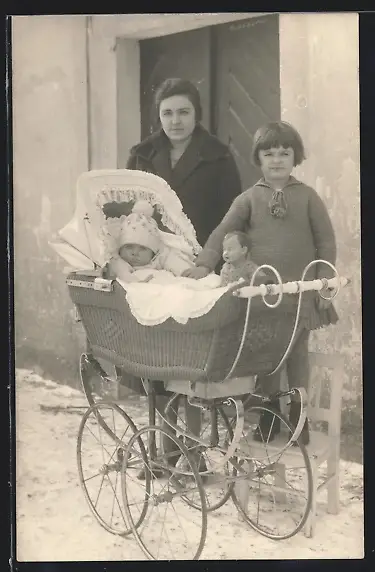 AK Mutter mit Tochter und Kleinkind im Kinderwagen