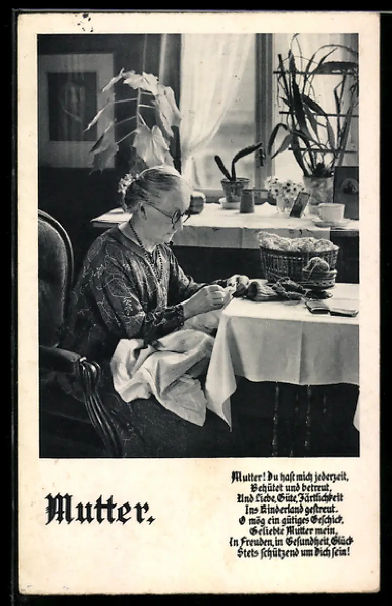AK Mutter strickt am Tisch, Muttertag