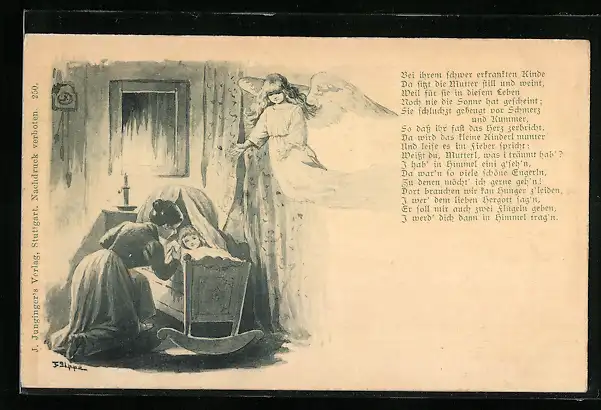 AK Mutter weint bei ihrem erkrankten Kinde, darüber ein Engel
