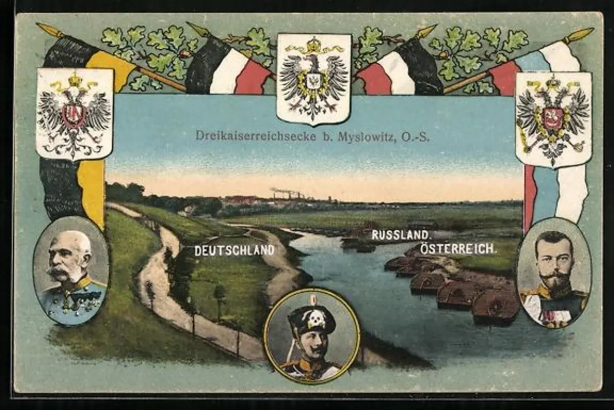 AK Myslowitz /O.-S., Dreikaiserreichsecke, Zar Nikolaus II., Kaiser Wilhelm II., Kaiser Franz Josef I.