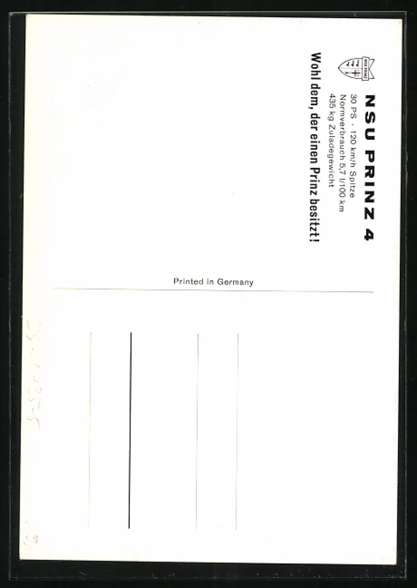 AK NSU-Prinz 4 vor einem Wohngebäude, Auto-Reklame
