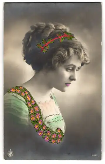 AK Nachdenkliche junge Frau in besticktem Kleid