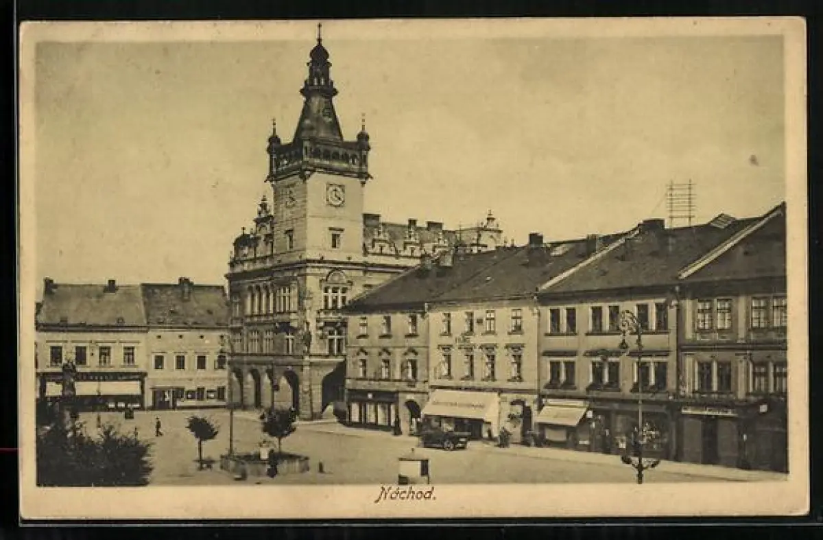 AK Nachod, Strassenpartie mit Geschäftshäusern u. Turmgebäude