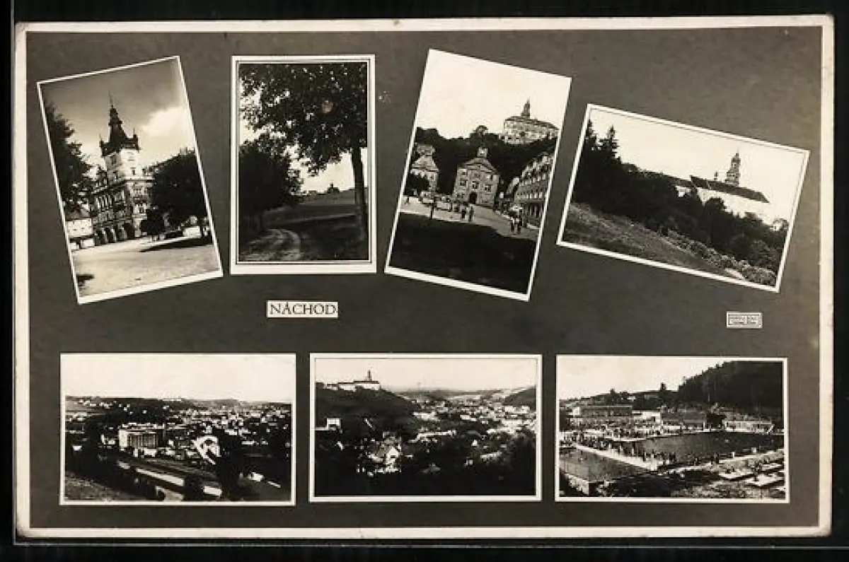 AK Nachod, Strassenpartie mit Schloss, Schwimmbad, Ortsansicht