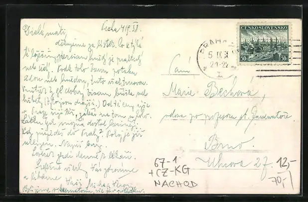 Personenbezogene Daten auf der Rückseite der Karte wurden durch blauen Textmarker unkenntlich gemacht. Die blauen Stellen sind auf die Vorderseite durchgeweicht und wirken sich negativ auf das Postkartenfoto aus