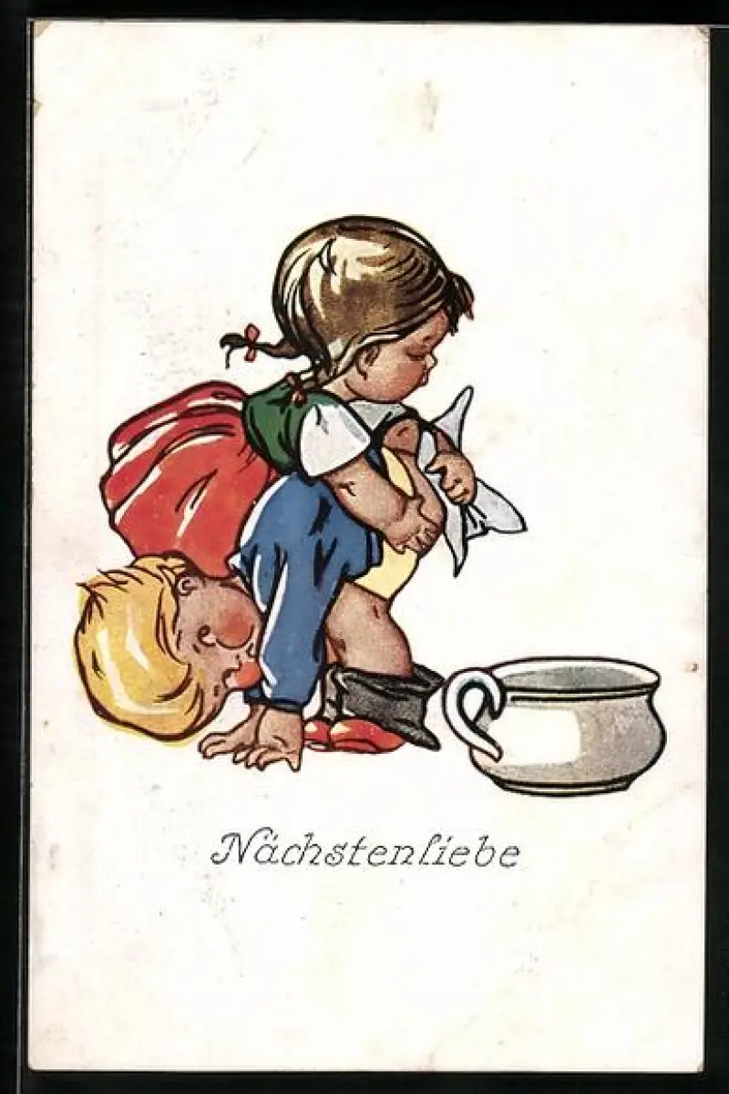 AK Nächstenlieb, Mädchen wischt Knaben den Popo sauber