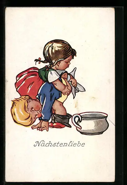 AK Nächstenliebe, Mädchen putzt einem Buben den Popo ab