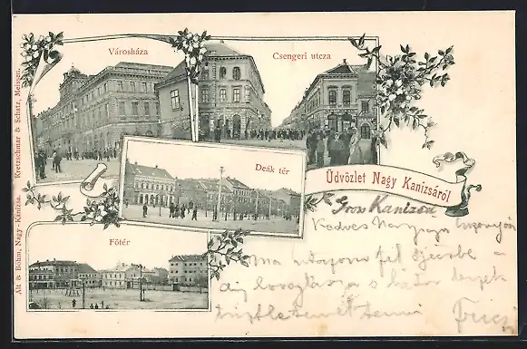 AK Nagy Kanizsá, Városháza, Csengeri utcza, Fötér, Deák tér